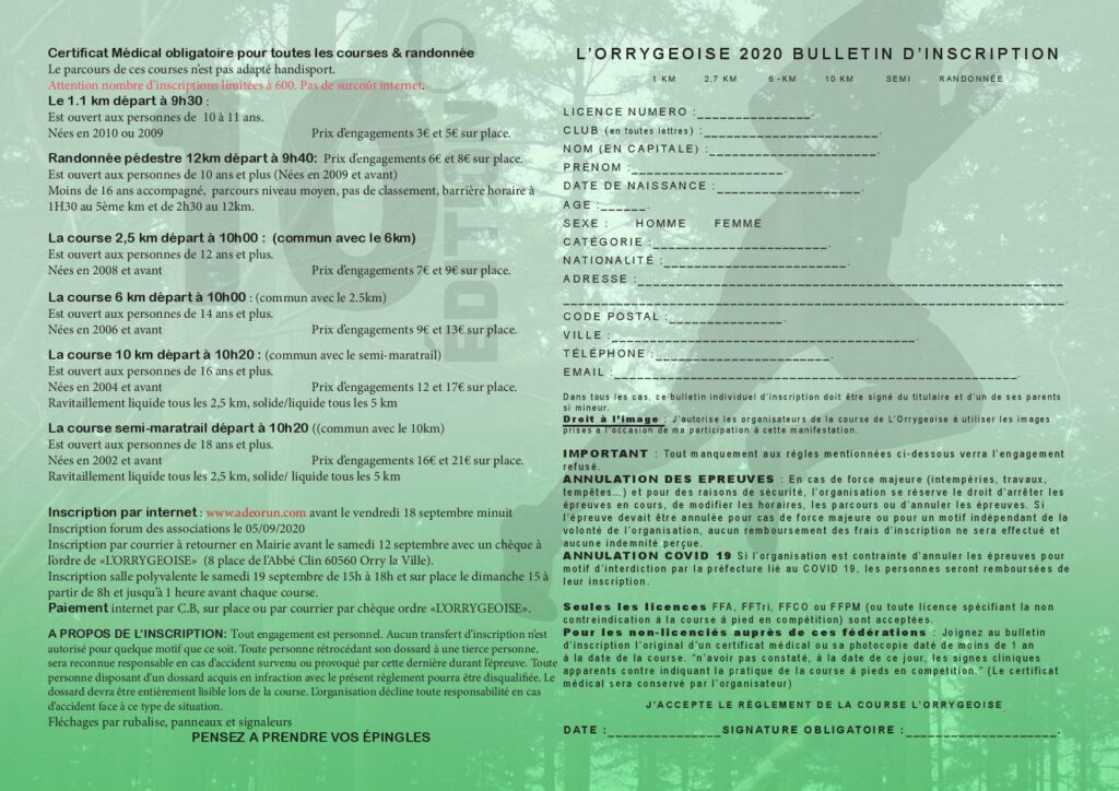 Possibilité d’inscription au forum des associations le samedi 5 Septembre , par courrier à déposer en mairie avant le 12 Septembre (chèque à l’ordre de l’Orrygeoise – 8 Place de l’Abbé Clin 60560 Orry-la-ville), et le 19 Septembre à la salle polyvalente de 15h à 18h ainsi que le 20 Septembre à partir de 8h et jusqu’à une heure avant chaque course.